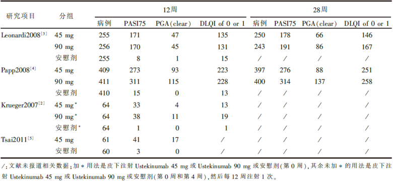 2个试验[3, 4]观察了Ustekinumab 45 mg组和Ustekinumab 90 mg组治疗28周的疗效, 但均未观察安慰剂组28周的疗效。