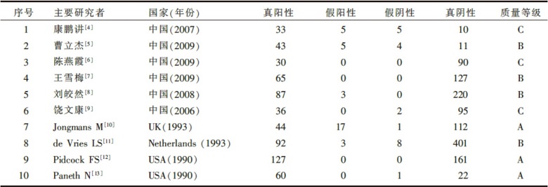 两名作者在未了解文献的发表情况(如发表杂志的影响因子等)的状况下, 分别对最终入选的文献进行独立评价。当意见不一致时, 两名作者通过讨论来评价诊断性试验的真实性、重要性及实用性。从各篇文献提取的资料包括:研究作者、发表时间、研究对象所在国家、研究对象平均年龄、研究对象例数、真阳性值、假阳性值、假阴性值、真阴性值、是否使用盲法、是否随机、是否随访以及质量分级。