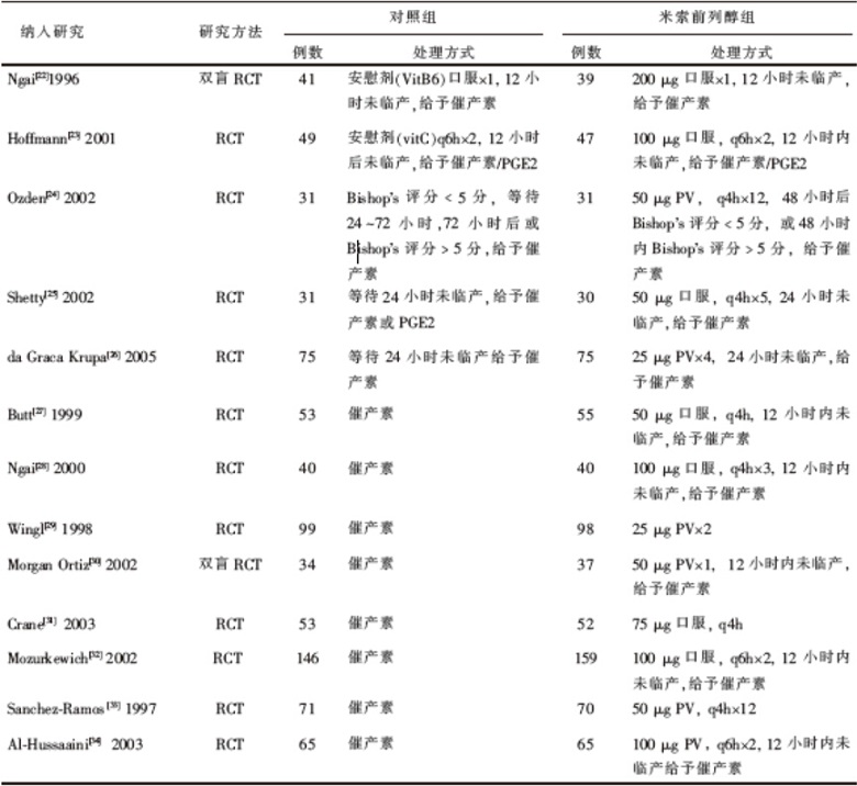 足月胎膜早破:包括比较期待治疗、使用安慰剂与使用米索前列腺素和催产素引产等方法进行比较。