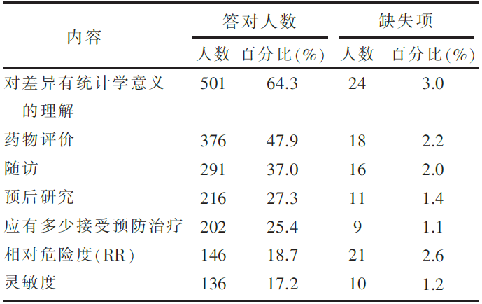 调查发现,研究对象中选修过医学统计学、流行病学、预防医学、文献检索及循证医学的人分别占调查总人数的1.6%、4.9%、6.8%、10.2%及2%。另外为考查循证医学开课前相关课程学生基本概念的掌握情况,问卷中设置了7个卫生统计学及流行病学相关知识问题,调查发现,答对7个题目的有0人,占回答人数的0%,答对6个的有6人,占回答人数的0.7%,答对5个的有40人,占回答人数的5.4%,答对4个的有99人,占回答人数的13.5%,答对3个的有190人,占回答人数的25.8%,答对2个的有211人,占回答人数的28.7%,答对1个的有141人,占回答人数的19.2%,答对0个的有49人,占回答人数的6.7%。各题回答的正确率详见 表1。