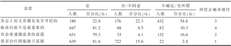 调查对象中不确定杂志上的专业文章都真实可信的同学有432人,占回答人数的54.8%,回答是与否的人数分别占回答人数的22.8%、22.4%,15人数值缺失,占总人数的1.9%;认为临床经验不是最重要的有68人,占回答人数的8.5%,回答是及不确定的人分别占回答人数的81.2%、10.3%,缺失数值有6个,占总数的0.7%;在临床实践中认为有必要遵循患者意愿的同学有631人,占回答人数的79.3%,回答否与不确定的人数分别占回答人数的4.1%、16.6%,缺失值有7个,占总数的0.9%;有639个同学认为目前许多临床治疗措施缺乏强有力的证据,占回答人数的81.6%,不同意及无所谓的同学分别占回答人数的15.6%、2.8%,缺失值有20人,占总数的2.5%,详见 表2。