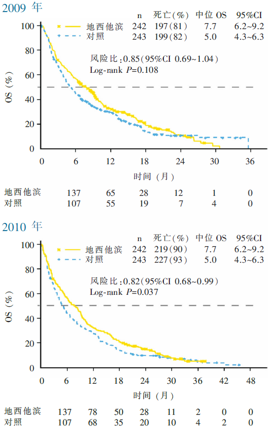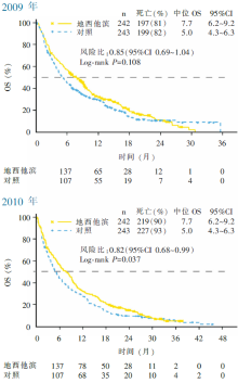 随访至2009年,共有396例患者死亡(死亡率81.6%)。地西他滨组中位OS 7.7个月[95%可信区间(confidence interval, CI)6.2~9.2个月],对照组为5.0个月(95%CI 4.3~6.3 个月),无明显差别(风险比0.85,95%CI 0.69~1.04, P=0.108)。随访至2010年,共有446例患者死亡(死亡率92%),两组的中位OS与2009年随访结果相同,但地西他滨组略显优势(风险比0.82,95%CI 0.68~0.99, P=0.037),见 图1。地西他滨组CR+CRp(CR伴血小板不完全恢复)为17.8%,对照组为7.8%( P=0.001)。地西他滨组患者中位疗程数为4个疗程,Ara-C对照组的中位疗程数为2个疗程。至2009年,药物相关不良事件发生率地西他滨组为74%、Ara-C组为73%(基本相似);地西他滨组最常见的药物相关不良反应是血小板减少(27%)和中性粒细胞减少(24%)。30天内的死亡率地西他滨组为32%(副作用相关死亡率24%),Ara-C组为28%(副作用相关死亡率19%)。