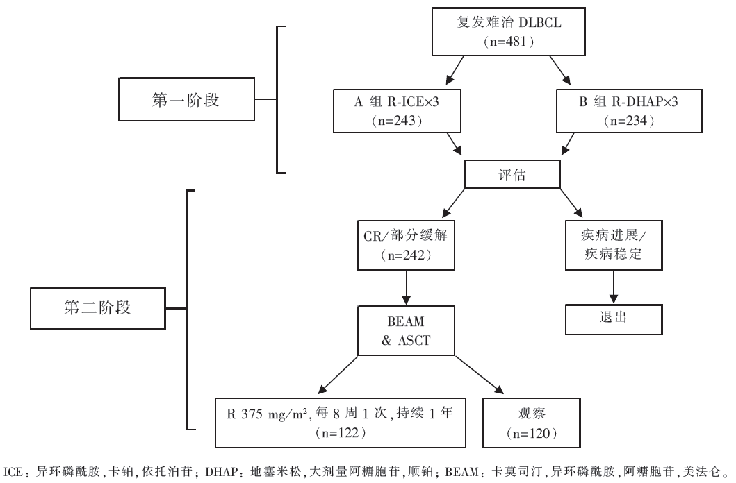 •研究对象:481例18~25岁的侵袭性CD20+B细胞淋巴瘤患者,治疗后复发或应用标准含蒽环药物方案化疗未达完全缓解、ECOG 评分0~1分,无中枢神经系统受累,不伴有艾滋病病毒感染史、移植后淋巴增殖性疾病及脏器功能受损。