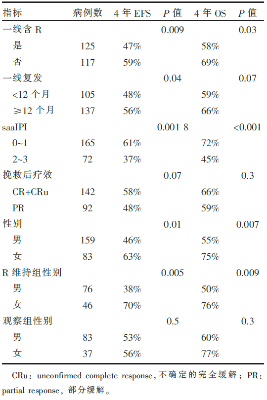 ASCT后二次随机分组,122例患者接受MR治疗、120例患者进入观察组,中位随访时间44个月。结果显示MR治疗组并无明显临床获益(见 表1),且100天后严重不良事件(serious adverse events, SAE)发生概率及死亡病例数均较观察组高(SAE 35% vs. 20%;死亡6例vs. 3例)。对影响ASCT后EFS的单因素分析显示,复发时间<12个月、年龄校正后国际预后指数(secondary age-adjusted International Prognostic Index, saaIPI)为2~3分、一线治疗方案已含R方案,以及男性患者均为预后不良因素( P<0.05,见 表2)。而影响MR治疗预后的多因素分析提示saaIPI 2~3分和男性患者为重要负面预测因子。