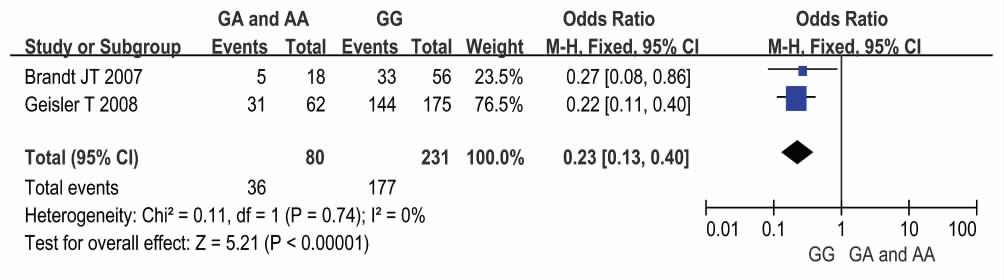 2篇文献报道了氯吡格雷敏感状态与CYP2C19基因多态性的关系[ 22, 26]。异质性检验结果表明研究之间无统计学异质性(χ2=0.11, P=0.74),故采用固定效应模型进行合并分析。高敏感组有231例,低敏感组有80例,以A等位基因为暴露因素,G等位基因为非暴露因素。结果显示,有A等位基因的人群(AA组和GA组)对氯吡格雷的敏感性明显低于有G等位基因的人群(GG组)[OR=0.23,95%CI(0.13,0.40)],差异有统计学意义( P<0.05),统计结果见 图1。
