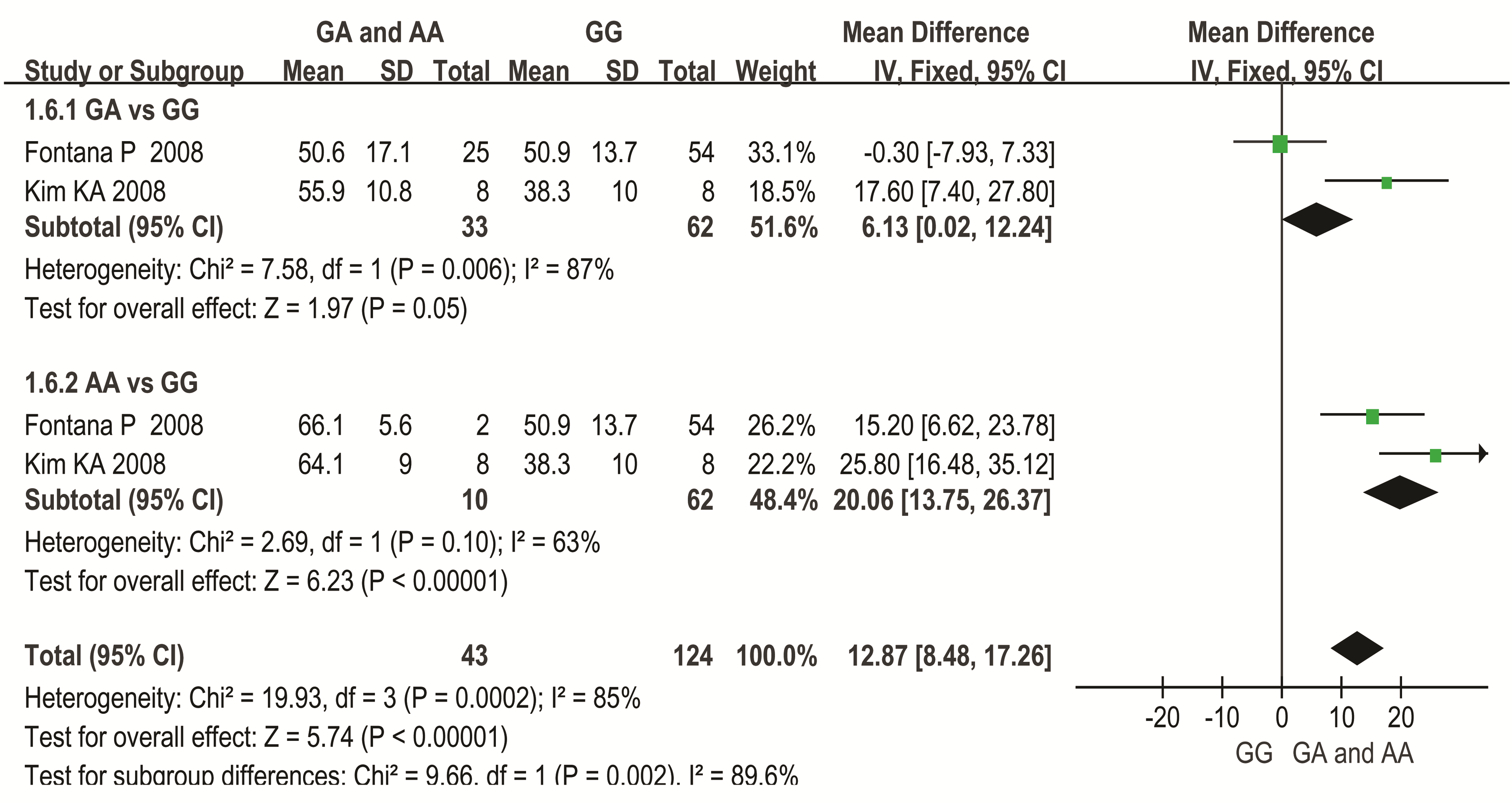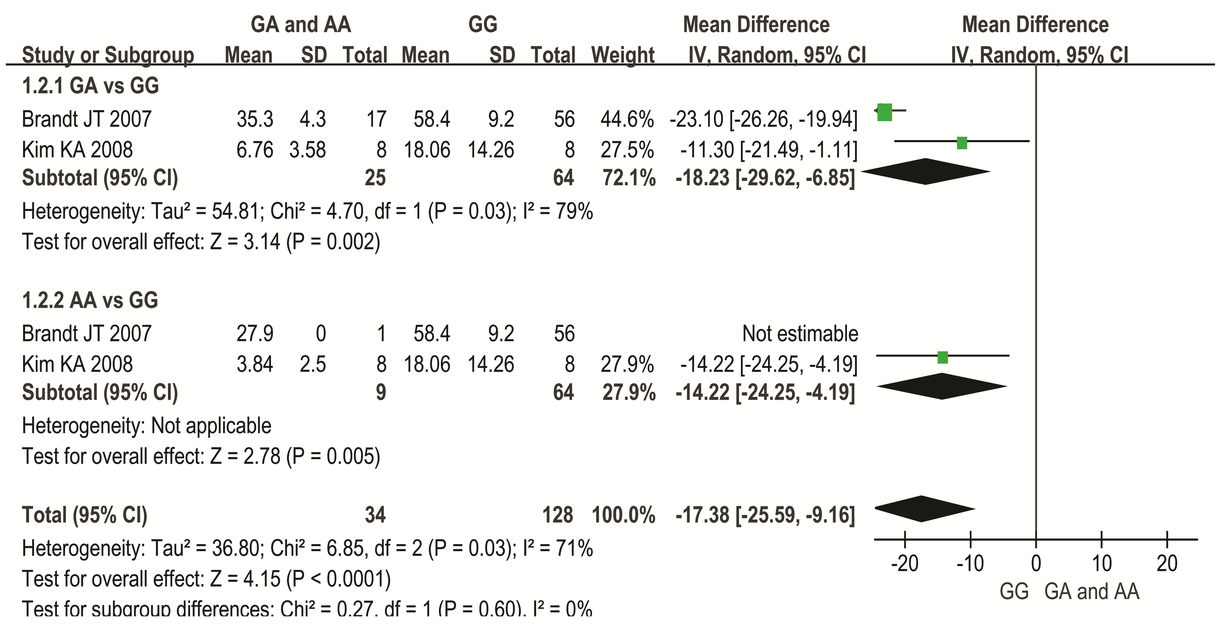2篇文献报道了氯吡格雷血浆浓度与CYP2C19基因多态性的关系[ 22, 23]。异质性检验结果表明研究之间存在统计学异质性(χ2=6.85, P=0.03),故采用随机效应模型进行合并分析。GG组有128例,GA组有25例,AA组有9例。结果显示,给予相同量的氯吡格雷,经过相同时间后检测,AA组和GA组血浆药物浓度明显低于GG组[MD=-17.38,95%CI(-25.59,-9.16)],差异有统计学意义( P<0.05),统计结果见 图2。