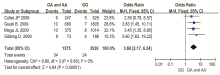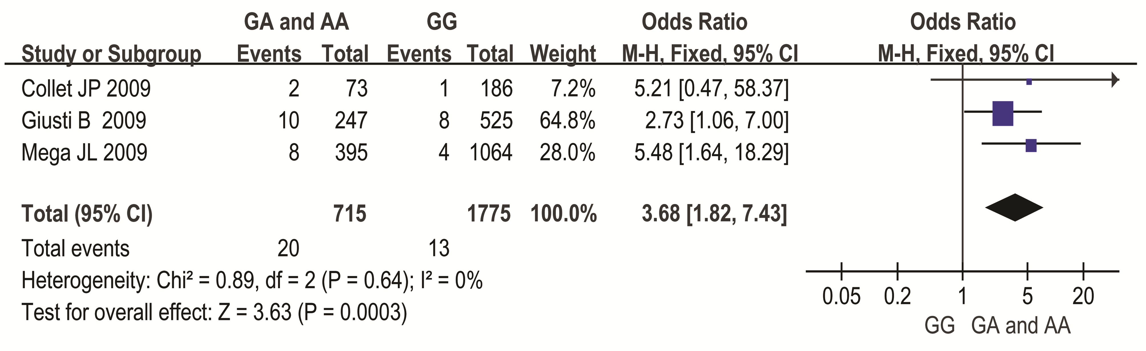 3篇文献报道了血栓造成的死亡事件与CYP2C19基因多态性的关系[ 21, 29, 30]。异质性检验结果表明研究之间无统计学异质性(χ2=0.89, P=0.64),故采用固定效应模型进行合并分析。GG组有1 775例,GA组和AA组有715例。结果显示,在发生由于血栓造成的死亡事件方面,AA组和GA组死亡率明显高于GG组[OR=3.68,95%CI(1.82,7.43)],差异有统计学意义( P<0.05),统计结果见 图5。