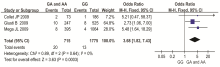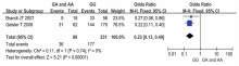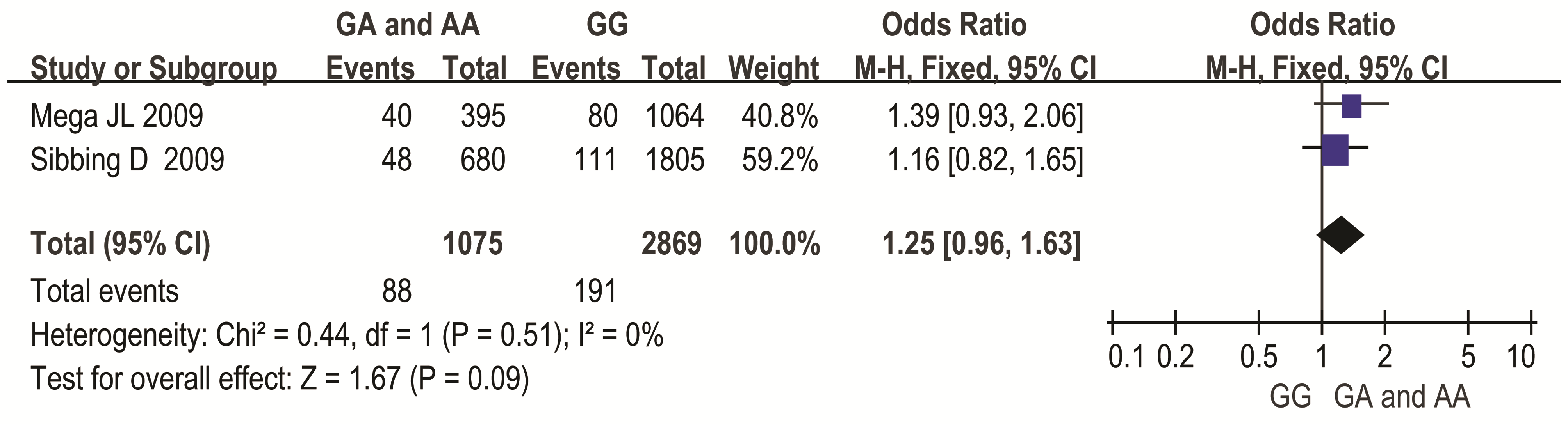2篇文献报道了心肌梗死事件与CYP2C19基因多态性的关系[ 21, 28]。异质性检验结果表明研究之间无统计学异质性(χ2=0.44, P=0.51),故采用固定效应模型进行合并分析。GG组有2 869例,GA组和AA组有1 075例。结果显示,在发生心肌梗死事件方面,AA组和GA组与GG组无差别[OR=1.25,95%CI(0.96,1.63)],差异无统计学意义( P>0.05),统计结果见 图6。