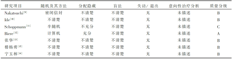 纳入的7个随机对照试验中,仅2个研究报道了具体的随机方法[ 9, 12],1个研究采用密闭信封进行随机,另1个研究则采用计算机产生随机数字表进行随机,其余研究没有报道具体的随机方法,仅有1个研究提到了充分的分配隐藏[ 12],其余研究均未提及分配隐藏和盲法,见 表2。