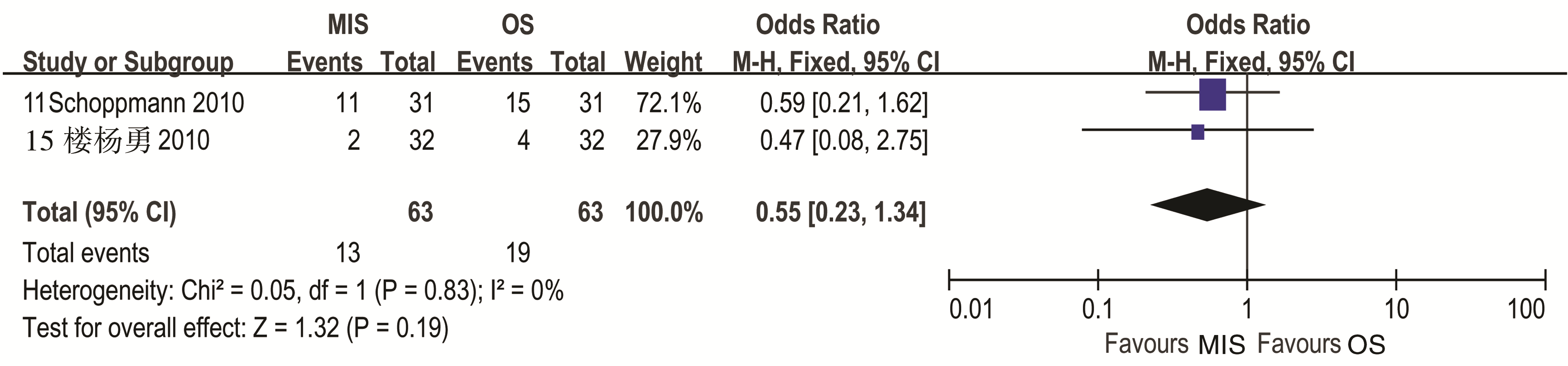 2个研究报告了食管癌术后复发率[ 11, 15],异质性检验结果为( P=0.83, I2=0%),故采用固定效应模型。Meta分析结果:OR=0.55,95%CI(0.23,1.34),提示微创手术组与普通开胸手术在食管癌术后复发率方面差异无统计学意义,见 图1。