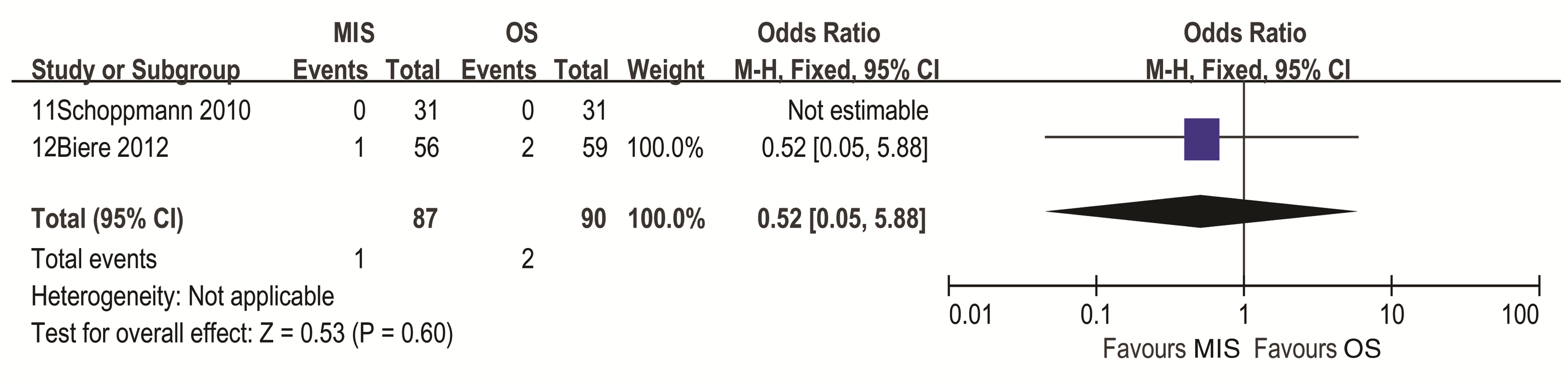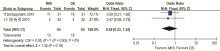 2个研究报告了食管癌术后死亡率[ 11, 12],异质性检验结果为( P=0.6, I2=0%),故采用固定效应模型。Meta分析结果:OR=0.52,95%CI(0.52,5.88),提示微创手术组与普通开胸手术在食管癌术后死亡率方面差异无统计学意义,见 图2。