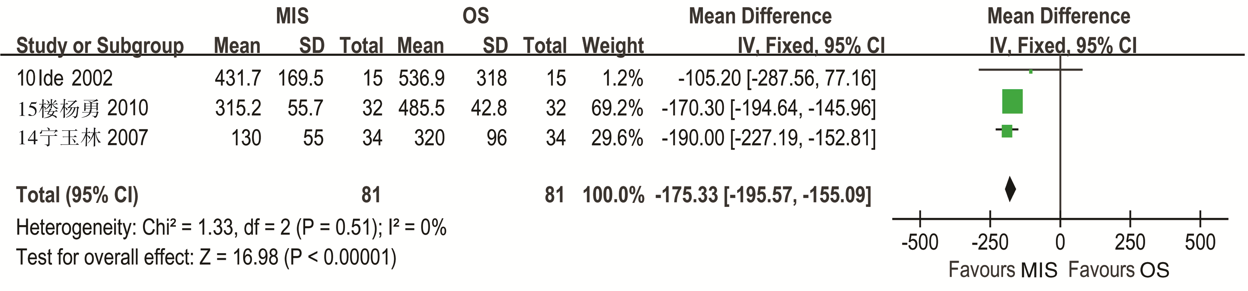4个研究报告了微创手术和普通开胸手术中的出血量[ 10, 12, 14, 15],1个研究结果不完整[ 12],不能进行合并分析,其余3个研究异质性检验结果为( P=0.51, I2=0%),故采用固定效应模型。Meta分析结果: WMD=-175.33 mL, 95%CI(-195.57, -155.09)mL,提示微创手术组患者的手术中出血量明显低于普通开胸手术,见 图3。