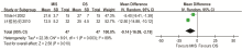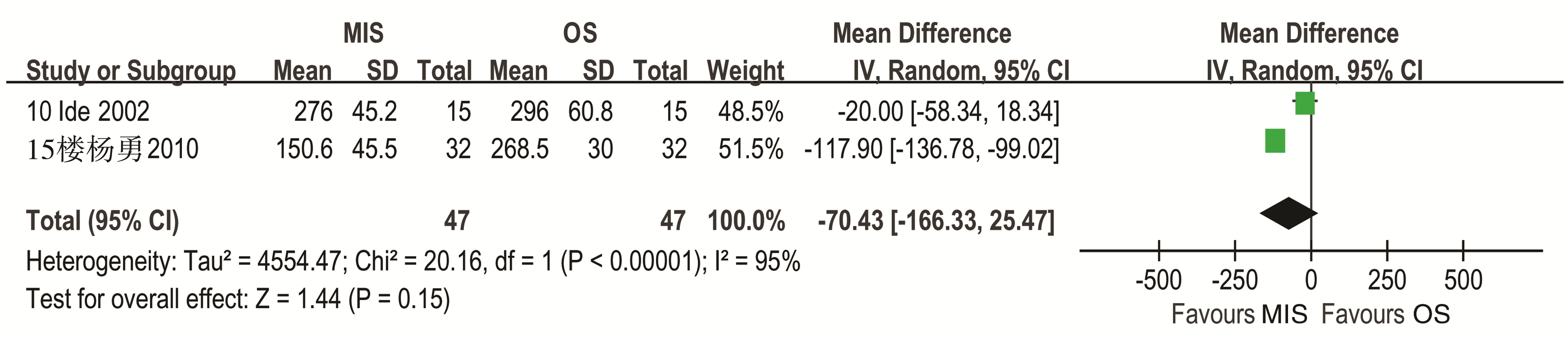 2个研究报告了微创手术和普通开胸手术的手术时间[ 10, 15],异质性检验结果为( P<0.000 01, I2=95%),故采用随机效应模型。Meta分析结果:WMD=-70.43分钟, 95%CI(-166.33,25.47)分钟,提示微创手术和普通开胸手术的手术时间差异无统计学意义,见 图4。