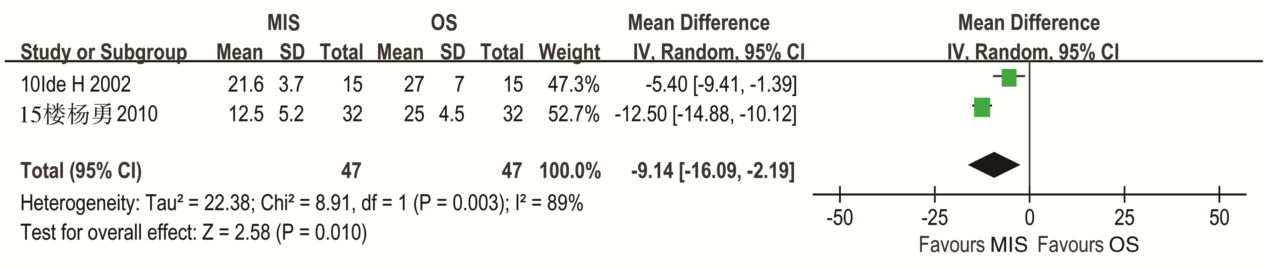 2个研究报告了食管癌术后住院时间[ 10, 15],异质性检验结果为( P=0.003, I2=89%),故采用随机效应模型。Meta分析结果:WMD =-9.14天,95%CI(-16.09,-2.19)天,提示微创手术组患者的住院时间明显短于普通开胸手术组,见 图5。