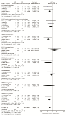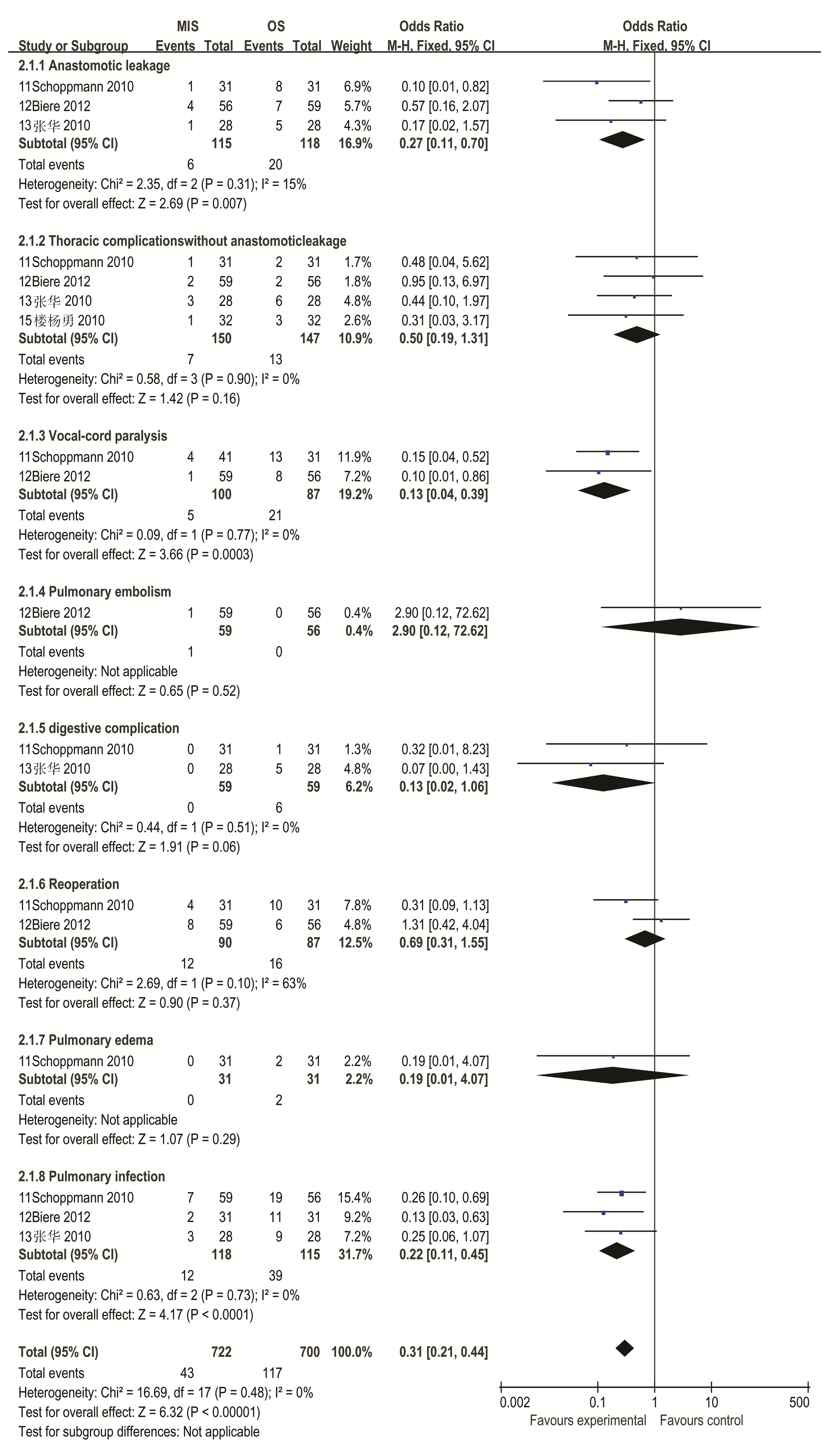 3个研究报告了微创手术和普通开胸手术后吻合口瘘的发生率[ 11, 12, 13],异质性检验结果为( P=0.31, I2=15%),故采用固定效应模型。Meta分析结果:OR=0.27, 95%CI(0.11,0.70),提示微创手术组患者手术后吻合口瘘的发生率明显低于普通开胸手术组。4个研究报告了微创手术和普通开胸手术后包括乳糜胸和脓胸等的胸部并发症的发生率[ 11, 12, 13, 15],异质性检验结果为( P=0.90, I2=0%),故采用固定效应模型。Meta分析结果:OR=0.50, 95%CI(0.19,1.31),差异无统计学意义。2个研究报告了微创手术和普通开胸手术后声带麻痹的发生率[ 11, 12],异质性检验结果为( P=0.77, I2=0%),故采用固定效应模型。Meta分析结果:OR=0.13, 95%CI(0.04,0.39),提示微创手术组患者手术后声带麻痹的发生率明显低于普通开胸手术组。2个研究报道了肺水肿和肺栓塞的发生率,差异无统计学意义[ 12]。2个研究报道了术后消化道并发症[ 11, 13],异质性检验结果为( P=0.51, I2=13%),故采用固定效应模型。Meta分析结果:OR=0.13,95%CI(0.02,1.06),差异无统计学意义。2个研究报道了再次手术的发生率[ 11, 12], Meta分析结果:OR=0.69, 95%CI(0.31,1.55),差异无统计学意义。3个研究报告了微创手术和普通开胸手术后肺部感染的发生率[ 11, 12, 13],异质性检验结果为( P=0.73, I2=0%),故采用固定效应模型。Meta分析结果:OR =0.22,95%CI(0.11,0.45),提示微创手术组患者手术后肺部感染的发生率明显低于普通开胸手术组。