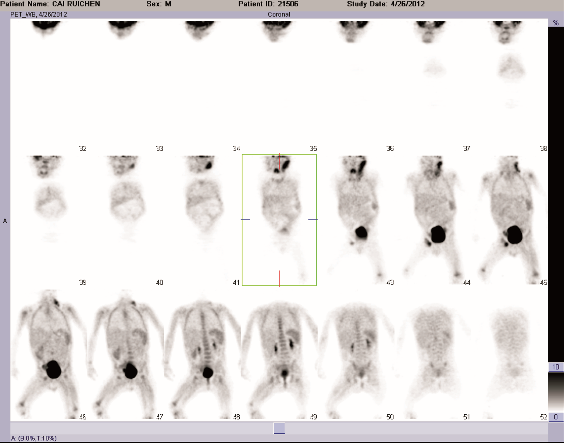 徐卫平(核医学科副主任医师):PET-CT检查提示全身多发中央及外周长骨骨髓不均匀放射性增高或减低,肝门区可见多发局灶性放射性浓聚,脾脏放射性药物摄取分布弥漫性增高,颈部、锁骨上窝、盆腔、腹股沟区多发淋巴结肿大,以左侧颈部淋巴结尤为显著,而腹股沟淋巴结代谢水平高,纵隔淋巴结肿大,但代谢水平不高。综合上述影像,考虑血液、淋巴系统恶性病变并骨髓、脾脏、肝门区淋巴结广泛浸润可能性大。
