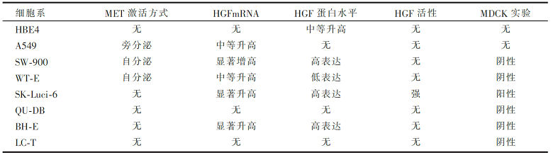 研究一:肝细胞生长因子(hepatocyte growth factor,HGF)高水平的异位表达能增强HGF/MET信号强度及致瘤性。然而在某些肿瘤中MET过表达可以引起自我激活而不依赖于自分泌机制,所以HGF自分泌的活性和HGF/MET激活状态在非小细胞肺癌(non⁃small cell lung cancer, NSCLC)中如何发生仍不得而知。