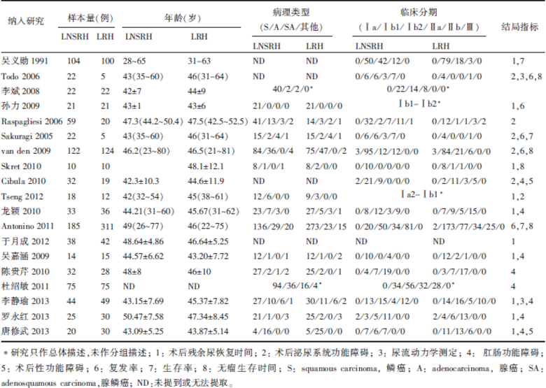本研究尚存在一定的局限性:(1)本研究仅检索了现有的中英文文献, 存在文献收录不全可能; (2)纳入的部分研究对照组的样本量偏少(3项研究对照组n≤ 10), 影响了研究的检验效能; (3)各研究结局指标不一, 如尿流动力学及术后直肠功能、性功能恢复等的评价标准不一, 且各研究术后随访时间不一, 影响了研究的合并; (4)本研究选择了NSRH的开腹手术进行比较, 以期使手术方式的统一, 保证研究的可靠性, 而其它手术方式、手术途径的比较, 本研究并未涉及。