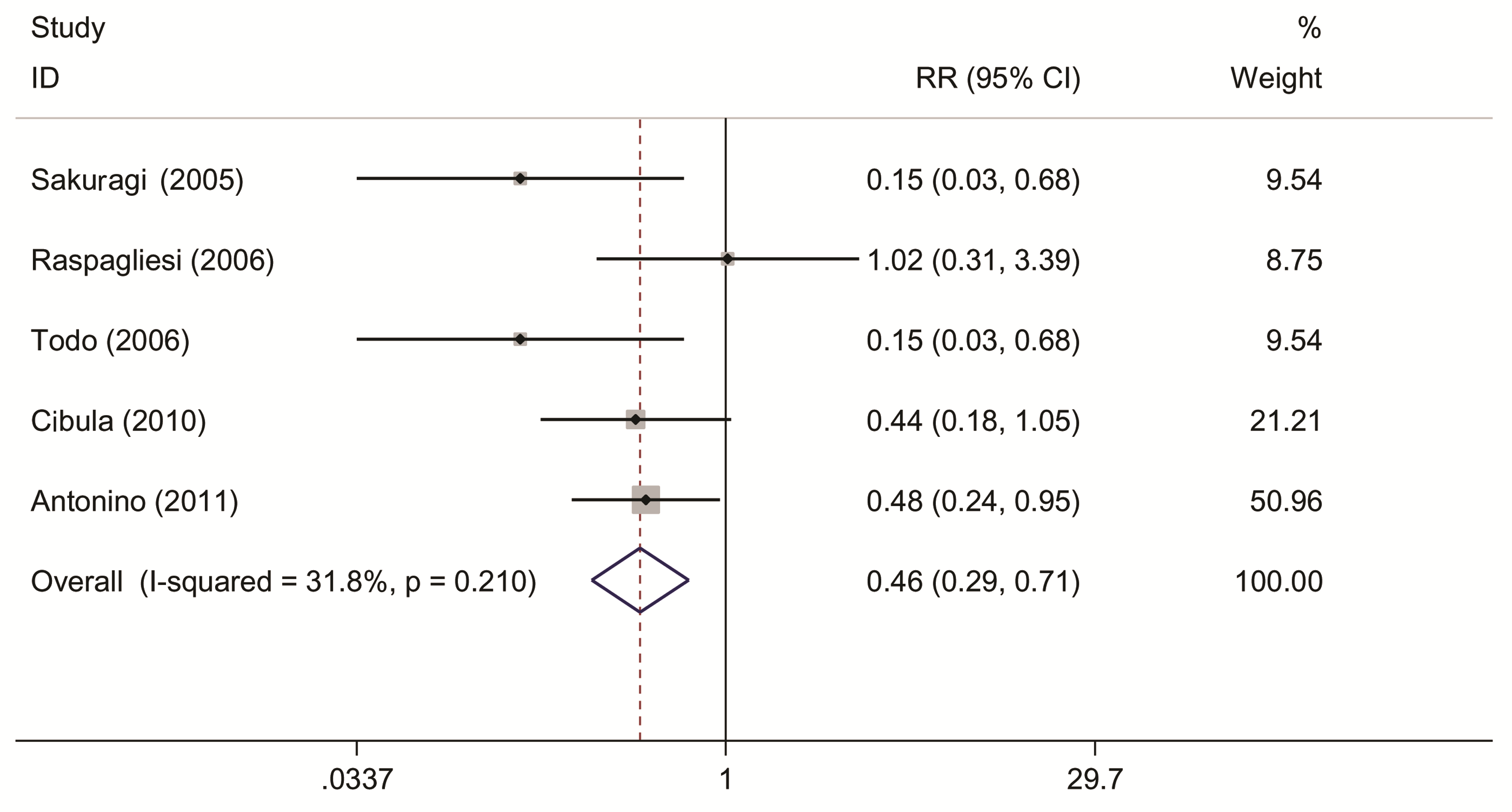 6项研究报道了患者术后膀胱功能紊乱的发生率[3, 4, 6, 10, 11, 14], 剔除1项无对照组数据的研究[10], 剩余5项研究[3, 4, 6, 11, 14](n=186)间无异质性(P=0.21, I2=31.8%), 采用固定效应模型合并分析。结果显示与RH组相比, NSRH组患者术后膀胱功能紊乱的发生率降低, RR=0.46, 95%CI(0.29, 0.71), P=0.001, 如图2。1项研究随访了两组术后膀胱功能情况, 在术后1个月RH组患者尿失禁率增高, 术后36个月RH组患者尿失禁、尿潴留、大便失禁及便秘的发生率明显增高。