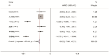 整理文献并分析数据, 数据录入与分析采用Stata software(version 11.0), 检验均为双侧检验, 检验水准α =0.05。二分类变量采用相对危险度(relative risk, RR)相应的95%可信区间(confidence interval, CI)为效应指标, 度量衡单位相同的连续变量采用加权均数差值(weighted mean difference, WMD)及以95%CI表示。各研究间的异质性用Q检验估计, 以P> 0.10为无异质性的临界值, 当各研究结果存在异质性时, 用随机效应模型计算合并效应量, 否则用固定效应模型计算合并效应量。当纳入研究足够多时, 利用漏斗图分析其发表偏倚。对不能合并分析的资料做描述性研究。