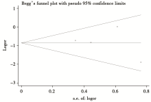 对NSRH组与RH组术后膀胱功能紊乱发生率进行分析, 如图4所示, 漏斗图基本对称, 所有资料对应的点均位于95%CI内, 尚不能认为存在发表偏倚。进一步通过Egger’ s 检验, 结果显示P=0.98> 0.05, 没有统计学意义, 说明各研究之间不存在发表偏倚。