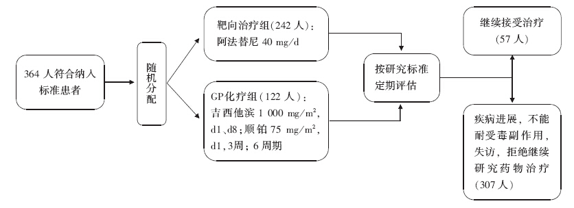 • 干预措施:患者以2∶ 1比例随机分为阿法替尼靶向治疗组和GP化疗组, 具体实施方案见图1, 按研究方案定期评估, 其中阿法替尼组患者若无预期毒副反应, 剂量可增加至50 mg/d, 若患者出现3度及以上与治疗相关的不良事件, 2度腹泻超过48小时, 2度恶心或呕吐超过7天, 2度及以上肾功能损伤, 停止治疗至少14天, 直至严重程度降至1度或恢复正常水平。