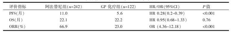 • 研究对象:未接受治疗的Ⅲ B期(存在胸腔积液)或Ⅳ 期肺癌患者, ECOG PS评分为0/1分, 按照RECIST1.1标准存在可测量病灶, 器官功能良好, 肿瘤组织经中心实验室确认EGFR突变, 病理学确诊为腺癌。