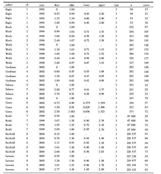 剂量反应的Meta分析只适合于分析三类研究数据:病例对照研究, 以人年为基础的队列研究, 以累计发病数为基础的队列研究。本次研究的具体数据可见曾宪涛《应用STATA做Meta分析》一书[4]。该研究共纳入9篇原始文献, 其中6篇为病例对照研究、3篇为队列研究(为人年队列研究)。数据格式是:研究作者(author, 字符型)、研究编号(id, 数值型)、发表年份(year, 数值型)、剂量(dose, 数值型, 一般取原始暴露剂量区间的中位数)、调整混杂后的效应量(adjrr, 数值型)、效应量95%可信区间(confidence interval, CI)下限(lower, 数值型)、效应量95%CI上限(upper, 数值型)、研究类型(type, 数值型, 分别用1、2、3表示人年队列研究、累计发病数队列研究和病例对照研究)、总数(n, 数值型, 人年队列研究则为各暴露剂量区间的随访人年数, 累计发病数队列研究和病例对照研究则为各暴露剂量区间人口数)、病例(cases, 数值型, 各暴露剂量区间的病例数), 具体数据见表 1。