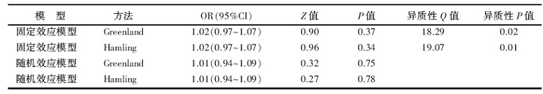 从SAS软件自动返回的结果(表2)中可以发现, 9项研究合并的异质性在Greenland和Hamling两种协方差矩阵估计方法下分别是:QG=18.29, P=0.02, QH=19.07, P=0.01, 两个结果相差不大, 表明研究之间还是存在一定的异质性。保守估计的话可以看随机效应模型的结果:ORG及95%CI 1.01(0.94~1.09), P=0.75; ORH及95%CI 1.01(0.94~1.09), P=0.78。提示牛奶制品的摄入量与卵巢癌患病风险间的联系无统计学意义。