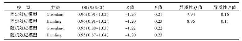 本次研究纳入队列研究和病例对照两种类型的研究, 而合并分析的结果显示具有异质性, 因此我们不妨做一个关于研究类型的亚组分析, 对6篇为病例对照研究和3篇为队列研究按照总体剂量反应Meta分析的方法分开来分析一下, 看是否能找到异质性的来源。6项牛奶制品摄入量与卵巢癌发病风险病例对照研究剂量反应分析结果见表3。Greenland和Hamling两种协方差矩阵估计方法下分别是:QG=7.94, P=0.16, QH=8.95, P=0.11。表明6项病例对照研究结果是同质的。固定效应模型的结果为:ORG及95%CI 0.96(0.91~1.02), P=0.21; ORH及95%CI 0.96(0.91~1.02), P=0.23, 提示牛奶制品的摄入量与卵巢癌患病风险间的联系无统计学意义。