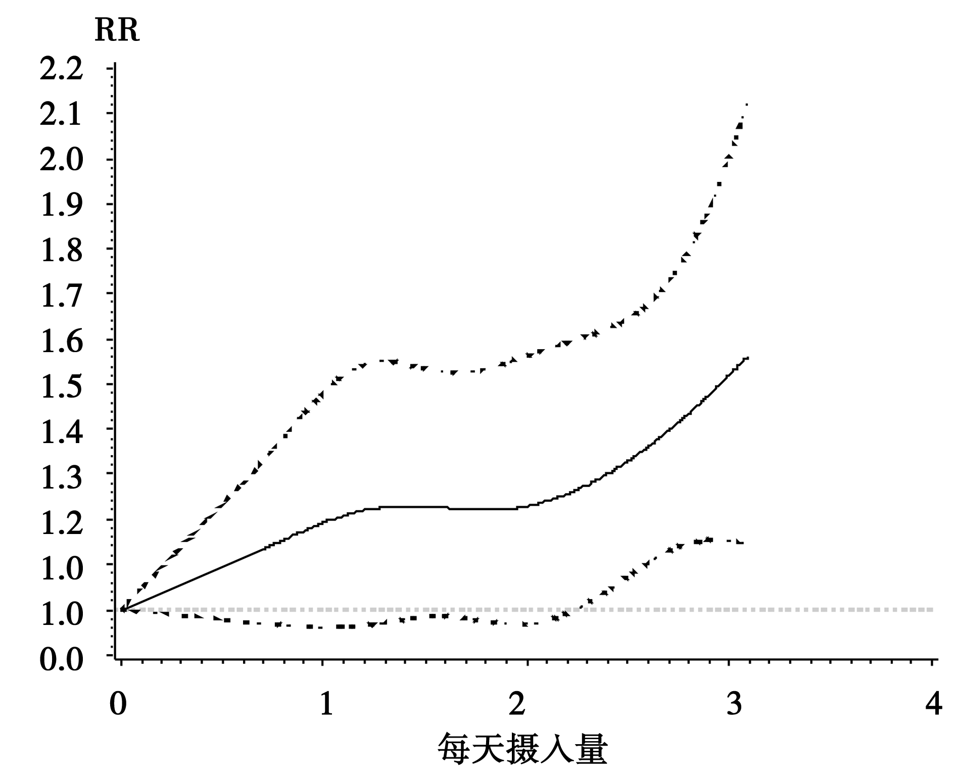 非线性剂量反应Meta分析使用限制性三次样条(restricted cubic spline)来作为链接函数:formula=logrr~rcs(dose, knots)。回归样条(regression spline)本质上是一个分段多项式, 但它一般要求在每个分段点上连续并且二阶可导。即:设自变量数据的范围在区间[a, b], 并根据需要分成k个段 a=t0< t1< …< tk-1< tk=b, 在每个区间[tk-1, ti)分别用一个多项Si(x)式表示, 则回归样条f(x)= Si(x)当x∈ [tk-1, ti), 并且fn(x)在[a, b]存在连续。限制性三次样条是在回归样条的基础上附加要求:样条函数在自变量数据范围两端的两个区间[t0, t1)和(tk-1, tk]内是线性函数, 满足上述性质的样条函数通常用Rcs(x)表示[7], 在SAS软件中%metadose宏将自动对每个研究进行默认nk=4的样条回归, 并以图形方式显示非线性剂量反应曲线。本例中3项牛奶制品摄入量与卵巢癌发病风险队列研究剂量反应曲线如图1。