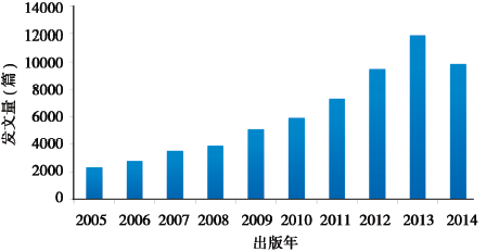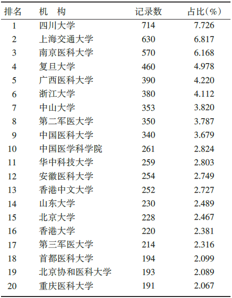 自1981年第1篇文章发表后, 发文量呈逐年递增趋势, 2013年全年共有2 782篇文章发表。排名前10位的机构依次为:四川大学华西医院(654篇)、兰州大学(415篇)、广西医科大学(285篇)、武汉大学人民医院(276篇)、四川大学(266篇)、山东大学(265篇)、重庆医科大学(230篇)、北京大学(214篇)、新疆医科大学第一附属医院(203篇)、兰州大学第一附属医院(185篇)。