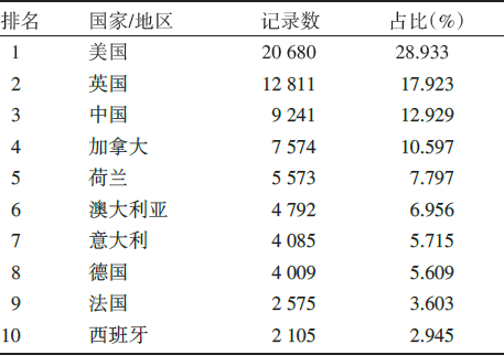 图1为检索得到的国内外SCI文章近10年的发文量情况, 整体上呈现明显的逐年递增趋势, 表明该领域一直受到大家的关注, 相关的研究和成果越来越多。考虑到网络发表的滞后性, 预计2014年的发文量将达到14 000篇。表1为发文量前10位的国家/地区排名, 北美和欧洲相关国家在该领域的发表的成果最多, 中国和澳大利亚分列第三和第六位, 前三位的美国、英国和中国的发文量占到了总发文量的近60%。