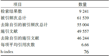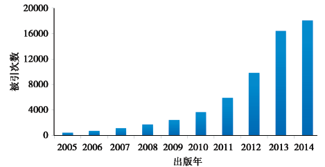 作者对来自中国的相关文献提取出来进行了进一步分析, 图2为近10年发表文章的情况, 2005年以后发文量增加趋势明显, 2013年全年发表了2 593篇, 预计2014年将会突破3 000篇。图3为SCI文章的被引情况, 被引次数直接反映了发表文章被关注程度和影响力。表2为被引频次和施引文献的情况汇总, 该表能够反映该领域所有文章的整体水平。每项平均被引次数6.54次, 表明该领域所有文章的平均影响力和被关注程度较高。将论文依被引频次从高到低进行排序, h-index 指的是第“ h” 个论文的施引文献数大于等于 “ h” 。例如, h-index 为20表示有20篇论文至少被引用20次。此度量标准减少了为高度引用的论文或尚未被引用的论文分配的不当权重。国人发表文章的h-index[5]为76, 表明有76篇文献被引用了76次以上, 该指标综合考虑了高被引论文和低被引论文的权重问题, 指数越大, 表明该领域的文章不单引用频次高, 而且高被引频次的文献数量也多。