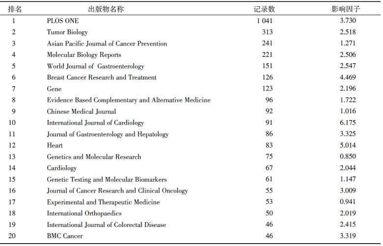 表3展示了中国发文量前20位的机构, 我国的四川大学位列第一位, 中国第一个循证医学中心(中国Cochrane中心)位于四川大学华西医院(原华西医科大学附属第一医院), 1999年经国际Cochrane协作网指导委员会正式批准, 也是国际Cochrane协作网的第十四个中心。四川大学在该领域一直处于国内领先。来源出版物排名(表4)中可以看出, 杂志的整体影响因子不高[6], 只有2本杂志的影响因子大于5分。PLOS ONE是收录我国循证医学SCI文章最多的期刊, 该期刊是美国公共科学图书馆出版的综合性期刊, 年出版文献量上万篇, 收录多种学科相关的文章, 开放获取, 需要缴纳一定金额的版面费。目前国内学者对该期刊的褒贬不一。PLOS ONE重视研究的规范和可靠性, 不考察研究的重要性, 因为多数学术研究的可靠性容易评价, 重要性、新颖性靠两三个审稿人评判, 失误率很高, 所以发表可靠的研究结果, 也符合国际科研人群最大众化的需求。论文的重要性和新颖性是在出版后接受同行评议的, 笔者认为它仍不失为一本好期刊。Tumor Biology是一本主要发表临床肿瘤相关的研究和综述类文章的杂志, 肿瘤标志物的转化研究是该杂志最感兴趣的方向, 肿瘤相关的循证评价文章可考虑投稿到该杂志。Asian Pacific Journal of Cancer Prevention是由泰国出版的一本有关癌症防治的SCI期刊, 需要缴纳一定的版面费, 目前的影响因子不高, 有肿瘤相关的药理及机制探讨的文章容易接收。Molecular Biology Reports主要收录分子和细胞生物学相关文章, DNA的复制、转录、核酸-蛋白相互作用、RNA的加工及胞内转运、蛋白质的生物合成等相关研究较易发表, 近年来我国学者在该杂志投稿的论文较多。
