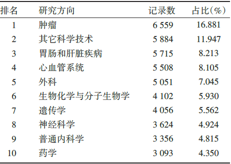 在中国知网数据库中共检索到14 549条结果。学科排名中肿瘤学(2 811篇)、中医学(1 789篇)、外科学(1 672篇)、心血管系统疾病(1 403篇)、内分泌腺及全身性疾病(1 038篇)、妇产科学(764篇)、消化系统疾病(747篇)、临床医学(731篇)、神经病学(729篇)和泌尿科学(682篇)位列前10位, 药学(350篇)和中药学(101篇)分列第19和25位。