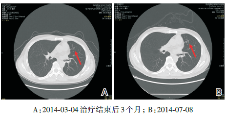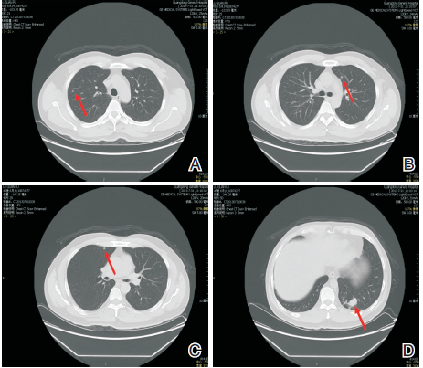 胸部CT(2013-07-31)示: 左肺下叶后基底段见一肿块影, 呈分叶状, 边缘见短毛刺, 后缘见胸膜牵拉征, 周围见少许斑片状模糊影, 增强后肿块较明显不均匀性强化, 其内可见小空泡征, 大小约22 mm× 15 mm。双肺野见多个小圆形结节影, 边界较清楚, 最大者直径约6 mm。诊断:考虑左肺下叶周围型肺癌并少许阻塞性肺炎, 建议穿刺活检; 考虑合并双肺多发转移(见图2)。