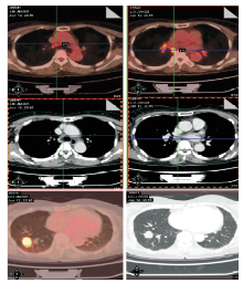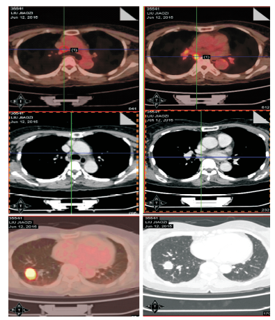 2015-06-12 PET/CT:右肺下叶结节, 大小约2.1 cm× 2.4 cm× 2.1 cm, SUVmax10.3, 区域多发肿大淋巴结(4R、7、10R、11-14R)糖代谢不同程度增高, 考虑右肺癌并区域淋巴结转移, 见图1。