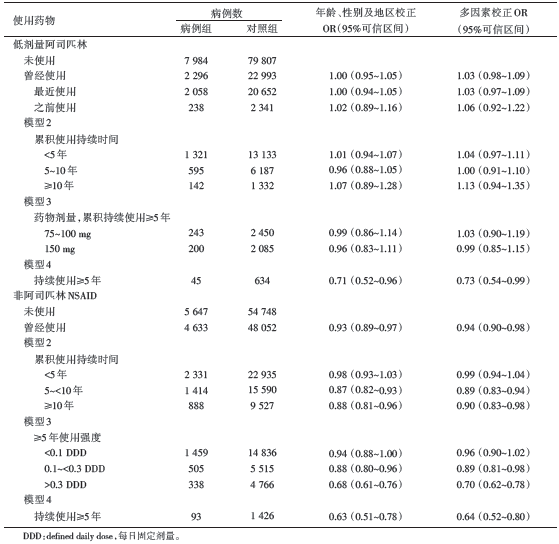 与对照组相比, 患者组曾经应用低剂量阿司匹林和非阿司匹林NSAID结直肠癌相关性的校正OR分别为1.03和0.94, 见表1。