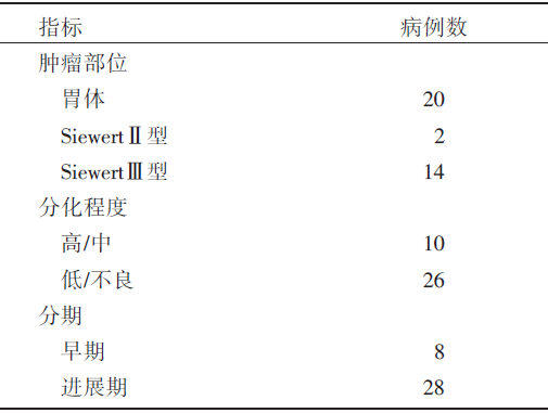 本组36例患者全部在腹腔镜下完成手术, 无中转开腹, 无手术相关死亡病例。36例患者中, 男性26例, 女性10例, 中位年龄为58岁[(57.3± 12.2)岁]。体质量指数为(22.74± 3.00) kg/m2。分期情况:0期1例, Ⅰ 期10例, Ⅱ 期13例, Ⅲ 期12例。肿瘤部位:胃体20例, SiewertⅡ 型2例, SiewertⅢ 型14例。肿瘤大小为(4.3± 2.7)cm。总淋巴结清扫个数为(24.2± 11.7)。全组患者的临床病理情况见表1。