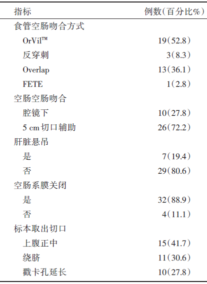 本组患者的消化道重建时间为(58.0± 32.7)min, 出血量为(137.7± 107.7)mL。总共有四种食管空肠吻合方式, 分别为OrVilTM 19例、反穿刺 3例、Overlap 13例、FETE 1例。7例患者选择了肝脏悬吊, 占19.4%。32例患者在消化道重建后关闭了空肠系膜。26例患者采用5 cm切口辅助完成空肠空肠吻合。全组患者的手术相关情况见表2。