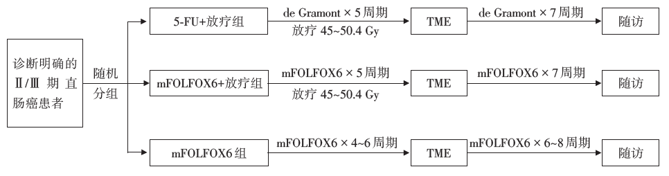 • 研究对象:诊断明确的Ⅱ (T3-4/N0)/Ⅲ (T1-4 /N1-2)期直肠腺癌患者, 患者PS评分≤ 1分且有足够的肝肾功能。以下患者需排除:有远处转移, 曾经接受过放疗或化疗, 合并其他肿瘤, 临床明确的心血管及精神疾病。