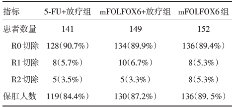 患者的手术情况见表1, 三组中, mFOLFOX6+放疗组的患者能进行R0切除的数量最多。