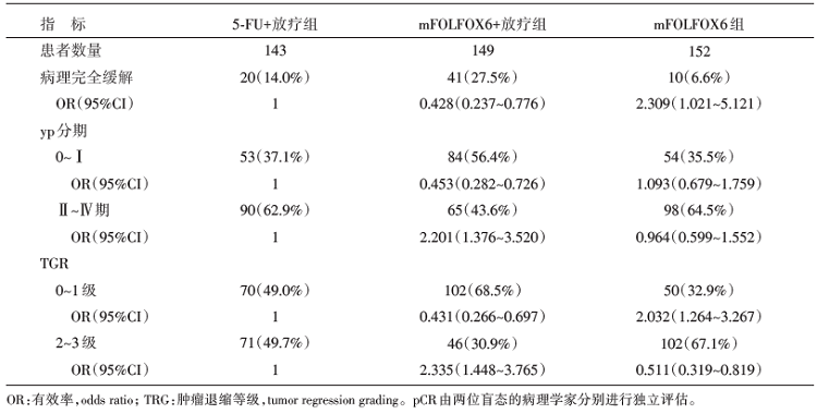 mFOLFOX6+放疗作为新辅助治疗比单纯5-FU+放疗有更高的pCR率, 但相对的, 毒性反应也比其他两组增加; 单纯mFOLFOX6作为围手术期化疗的pCR较低。但单纯化疗与5-FU+放疗相比, 肿瘤降期率相似, 且单纯化疗的术后并发症更少。