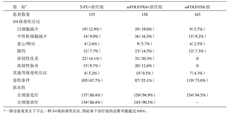 安全性方面, 几组患者主要的不良反应为白细胞及中性粒细胞减少, 放射性皮炎及放射性肠炎。其中, mFOLFOX6+放疗组的血液学毒性最多, 放射性皮炎及放射性肠炎的发生率也最高。见表3。