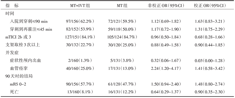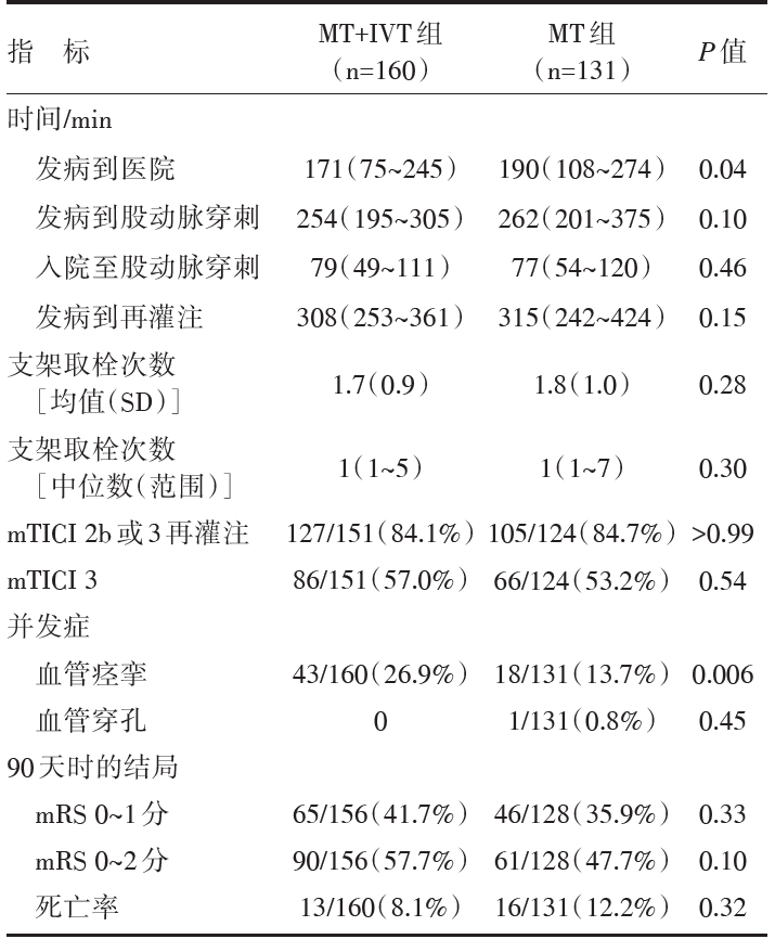 多变量分析中, IVT+MT组(n=160)和MT组(n=131)间的患者结局指标无显著的统计学相关性。具体多变量分析结果见表3。