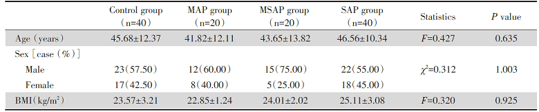 选取2018年1月至2019年12月在铜川市人民医院因“ 急性胰腺炎” 住院的患者共80例纳入本次研究, 根据患者是否达到“ 重症急性胰腺炎” 的诊断标准, 将患者分为轻症急性胰腺炎组(mild acute pancreatitis, MAP)、中重症急性胰腺炎组(moderate severe acute pancreatitis, MSAP)和重症急性胰腺炎组(severe acute pancreatitis, SAP), 其中MAP组20例, MSAP组20例, SAP组40例。“ 重症急性胰腺炎” 的诊断符合《2019年世界急诊外科学会重症急性胰腺炎诊治共识》中的诊断标准[6]。排除标准:(1)合并有糖尿病、胰腺占位等胰腺疾病; (2)非铜川市人民医院首诊患者, 入院前已接受过相应治疗; (3)合并有其他器官或组织感染, 感染与本次胰腺炎无关; (4)既往有多次胰腺炎发作病史; (5)患者或其家属不愿意参与本次研究。另选取同时期在铜川市人民医院进行体检的健康志愿者40例纳入对照组。所有受试者均在铜川市人民医院于临床干预前抽取2 mL静脉血, 送检验科检测。所有受试者纳入研究前均已知情, 并签署知情同意书, 本研究得到铜川市人民医院医学伦理委员会批准。四组受试者的一般资料比较, 差异无统计学意义(P> 0.05), 具有可比性, 见表1。
