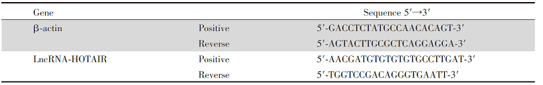 | 表2 β -actin和LncRNA-HOTAIR引物序列 Tab.2 Primer sequence of β -actin and LncRNA-HOTAIR |