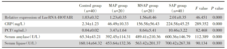 比较四组受试者血清LncRNA-HOTAIR水平及其他炎症相关指标, 如C反应蛋白(C-reaction protein, CRP)、降钙素原(procalcitonin)、淀粉酶、脂肪酶等; 分析血清LncRNA-HOTAIR水平与上述炎症相关指标的关系。评估血清LncRNA-HOTAIR对诊断急性胰腺炎的效能。