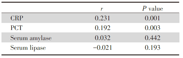 急性胰腺炎患者中血清LncRNA-HOTAIR水平与CRP(r=0.231, P=0.001)、PCT(r=0.192, P=0.003)成正相关, 但与血清淀粉酶、脂肪酶无显著相关性, 详见表4。